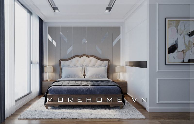 Giường ngủ gỗ kết hợp cùng nệm ốp đầu giường viền kim loại mạ vàng đã tạo nên vẻ đẹp sang trọng, quý phái cho phòng ngủ tân cổ điển cao cấp.