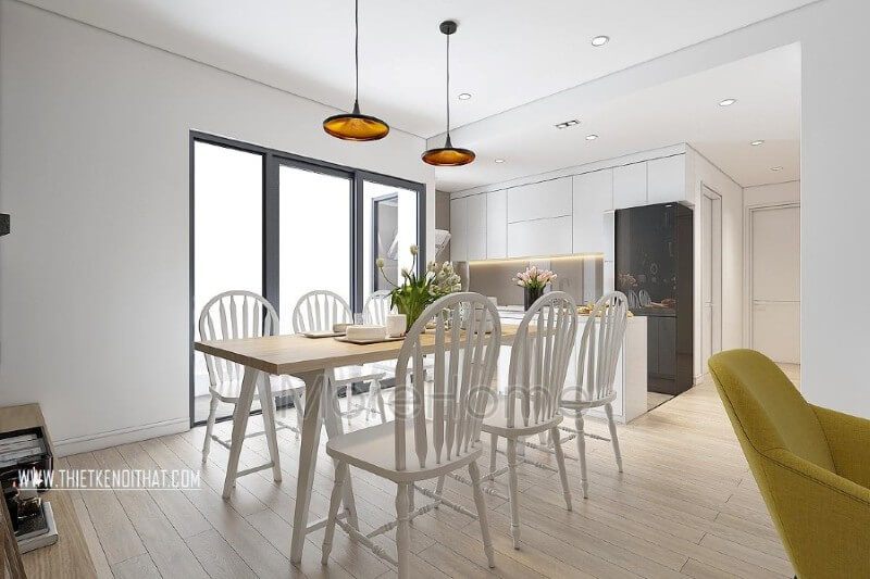 Bộ bàn ghế gỗ công nghiệp màu trắng thiết kế giản đơn, sử dụng các thiết kế thanh ngang không quá cầu kỳ vô thức tăng độ thoáng cho căn phòng