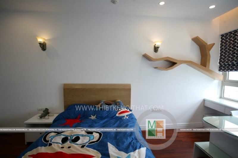 Không gian phòng ngủ bé trai được thiết kế sáng tạo, đơn giản, tạo được nhiều không gian cho bé học tập và vui chơi