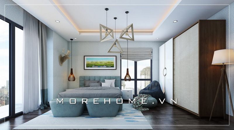 Bố trí nội thất phòng ngủ chung cư hiện đại khoa học, chiếc giường ngủ đa năng tích hợp thêm ngăn kéo phía dưới giúp tận dụng thêm được không gian cất giữ đồ đạc