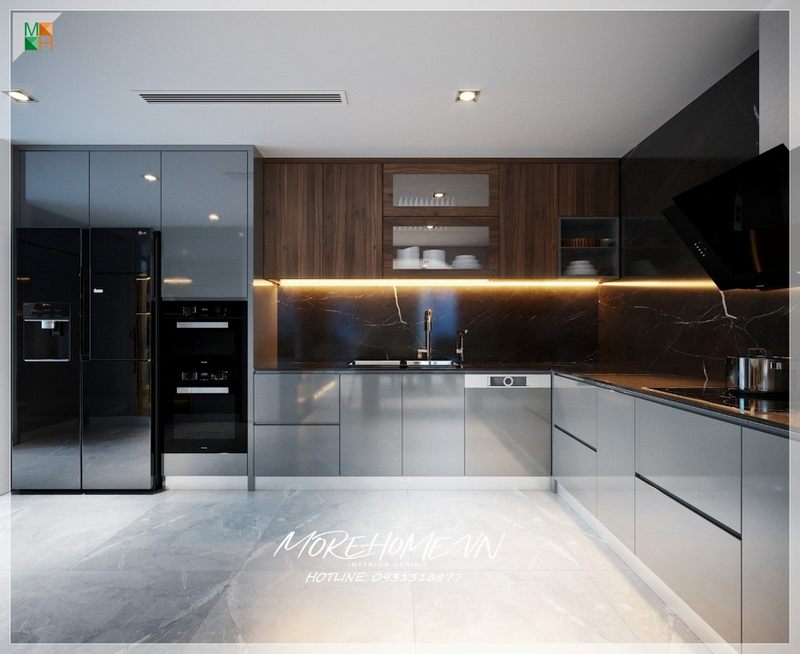 Mẫu tủ bếp chữ L bằng gỗ công nghiệp màu xám cho chung cư, nhà phố, biệt thự phong cách hiện đại đơn giản mà tiện nghi