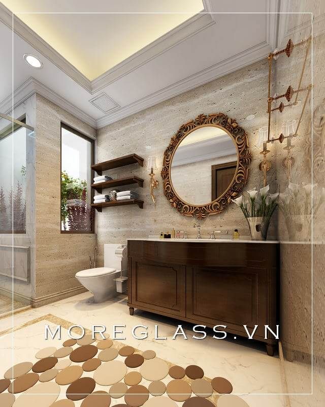 Mẫu gương phòng tắm ấn tượng với đường viền gương họa tiết sang trọng màu vàng đồng.