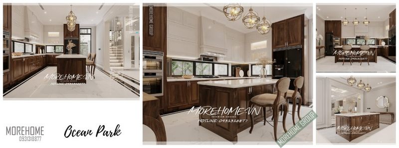 Nội thất phòng bếp với hệ thống tủ bếp phối màu giữa sắc trắng ngọc trai và sắc nâu trầm cùng những đường nét vân gỗ óc chó tự nhiên, sử dụng những chùm đèn kiểu dáng tinh tế độc đáo, tạo nên một không gian tân cổ điển vô cùng hoàn mỹ