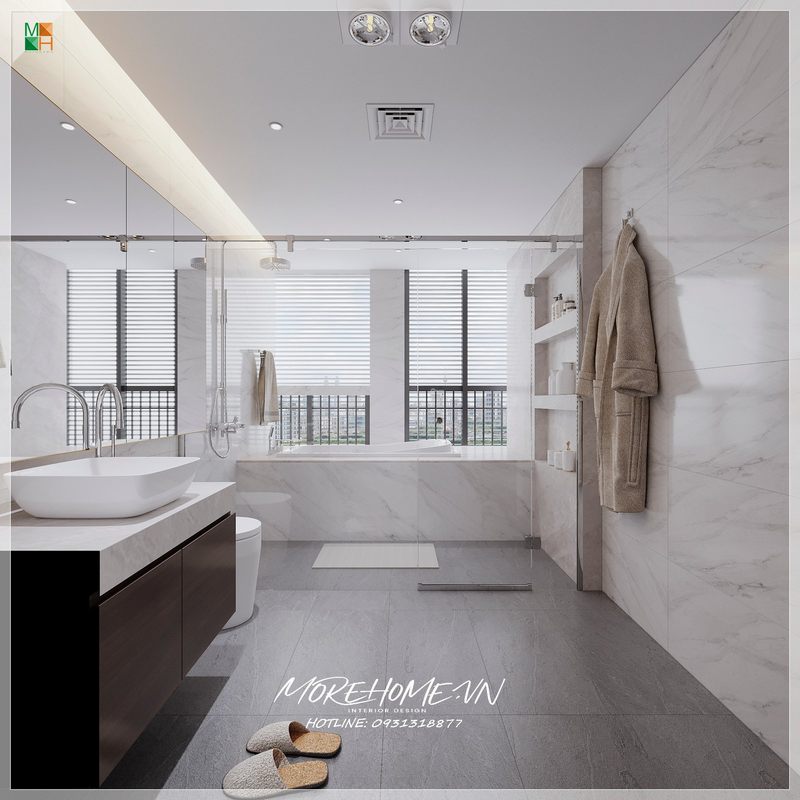 Mẫu thiết kế phòng tắm hiện đại cho chung cư, nhà phố, biệt thự với sự bố trí hợp lý, vách kính cường lực cửa trượt giúp ngăn khu vực tắm vòi lại để tránh bắn nước sang khu vực khác gây ướt át khó chịu