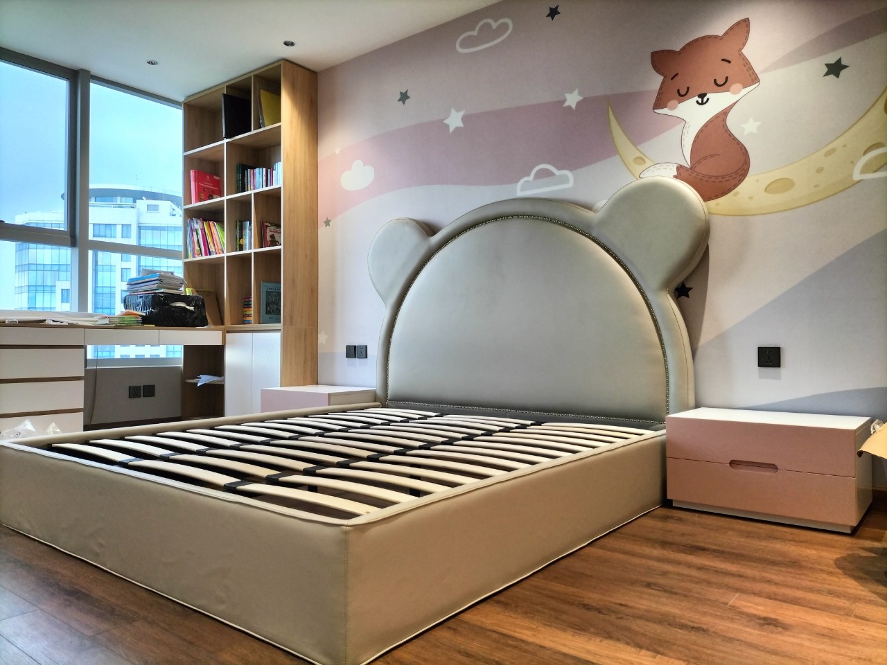 Phòng ngủ trẻ em cho bé gái, giường ngủ bọc da đầu giường hình dáng con chuột, tab gỗ công nghiệp màu hồng, tranh dán tường