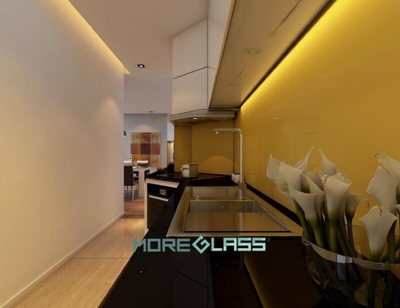 Trang trí mẫu kính ốp bếp cường lực màu vàng thư đẹp cho không gian phòng bếp chung cư, nhà phố, biệt thự.