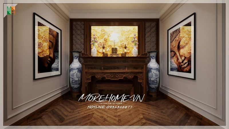 Mẫu thiết kế phòng thờ đẹp với nội thất gỗ tự nhiên cao cấp tông màu nâu trầm sang trọng với bộ bàn thờ gia tiên và bộ bàn ghế gỗ tạo nên không gian thờ cúng thiêng liêng