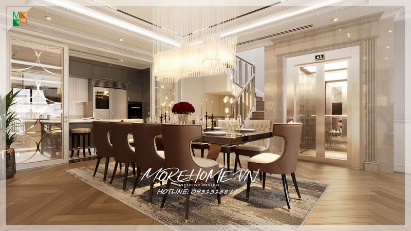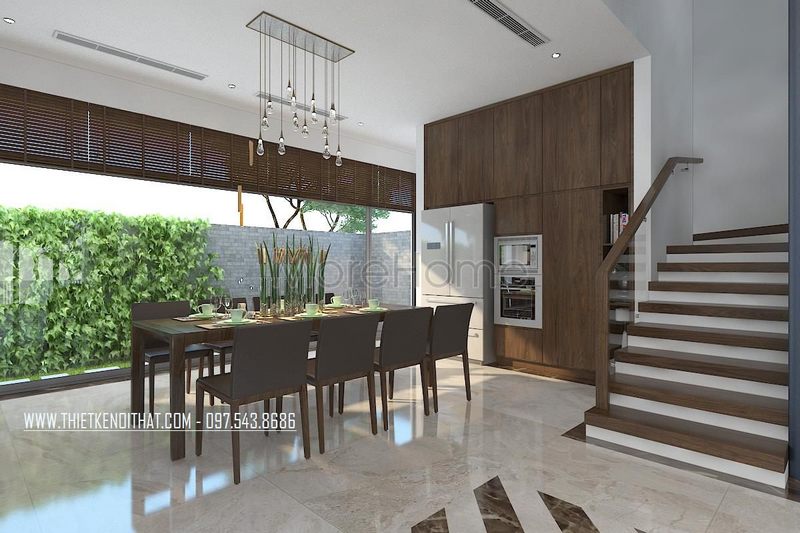 Thiết kế không gian phòng ăn biệt thự sang trọng với nội thất gỗ tự nhiên cao cấp tạo nên sự ấm cúng và đẳng cấp của ngôi nhà.