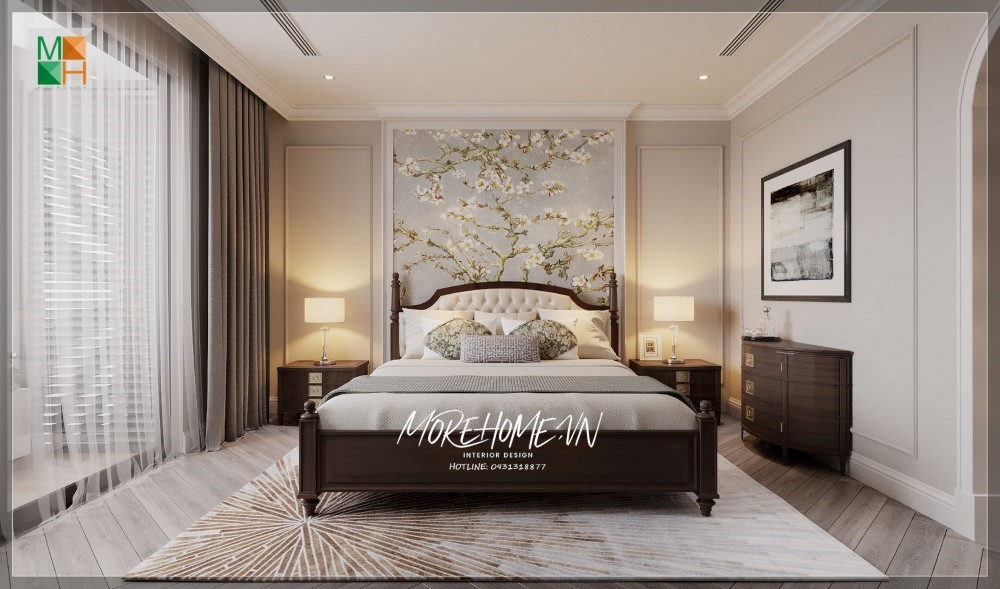 Giường ngủ gỗ tự nhiên tân cổ điển bọc da cao cấp làm cho khu vực phòng ngủ thêm sang trọng