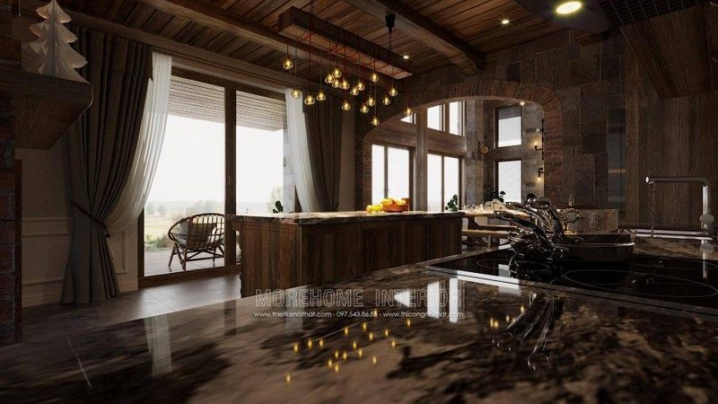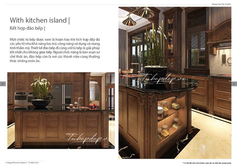 Mẫu đảo bếp từ gỗ tự nhiên kiểu tân cổ điển có mặt đá đen sang trọng cho không gian biệt thự, nhà phố thêm tiện nghi và đẳng cấp