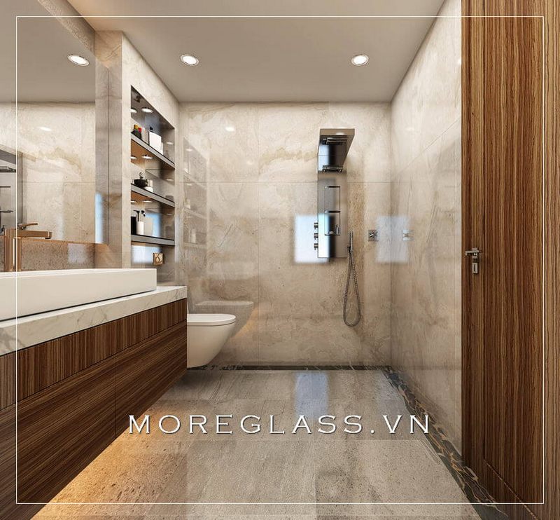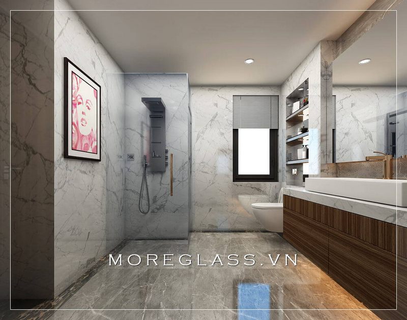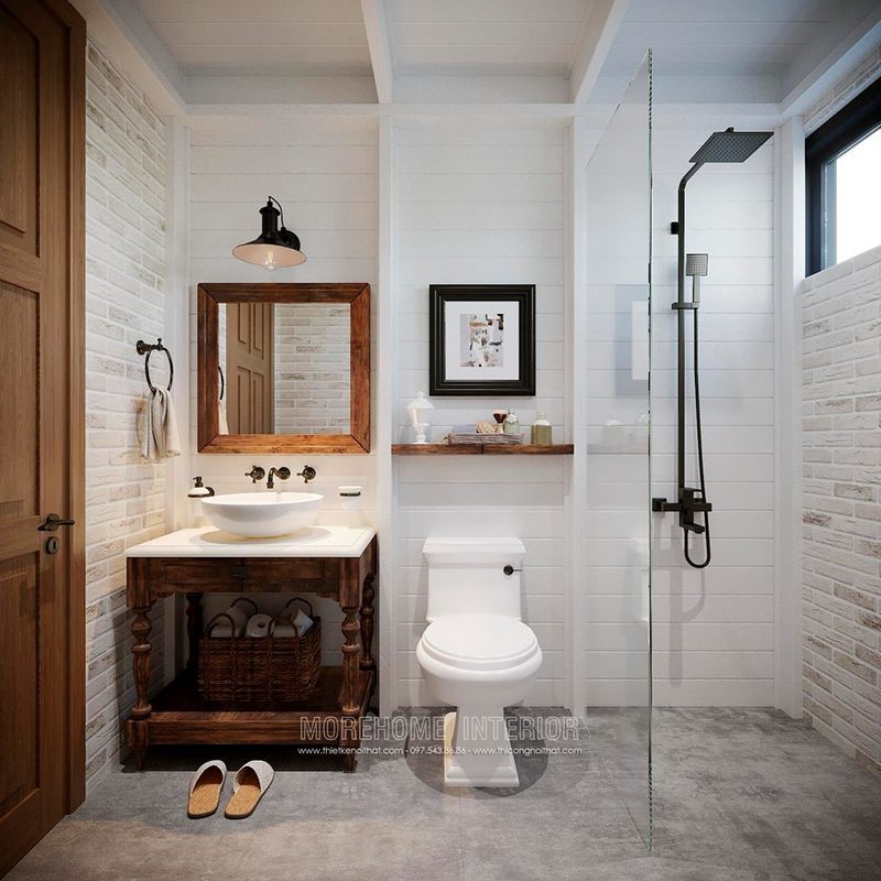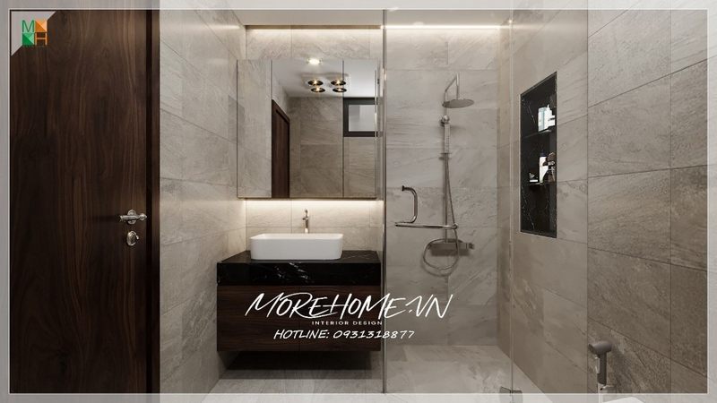 Để tránh sự nhàm chán khi sử dụng tông trắng làm chủ đạo, KTS Morehome đã khéo léo kết hợp gạch ốp tường và gạch lát sàn phòng tắm màu tối để tạo điểm nhấn, kết hợp vách kính tắm cường lực 2 bên giúp tạo sự liên kết trong không gian ngôi nhà