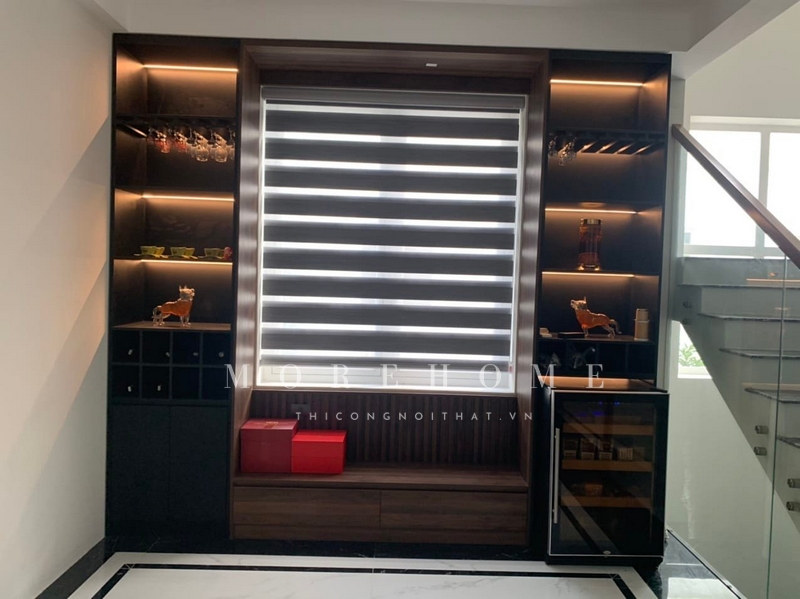 Thi công tủ rượu cánh kính tô điểm trang trí cho không gian ấn tượng những chai rượu được sắp xếp ngăn nắp trình tự thẩm mỹ cao.