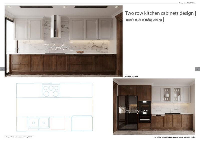 Phong cách tân cổ điển được thiết kế tối giản các chi tiết trang trí, sử dụng 2 màu sắc tủ trên dưới trắng - nâu lạ mắt, sáng tạo.