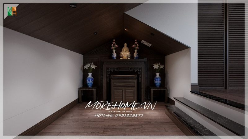 KTS đã khéo léo sắp đặt không gian thờ cúng bằng bộ bàn thờ gỗ tự nhiên và bên cạnh đó là bộ bàn ăn hiện đại nhỏ gọn giúp tiết kiệm diện tích mà vẫn mang lại sự sang trọng.