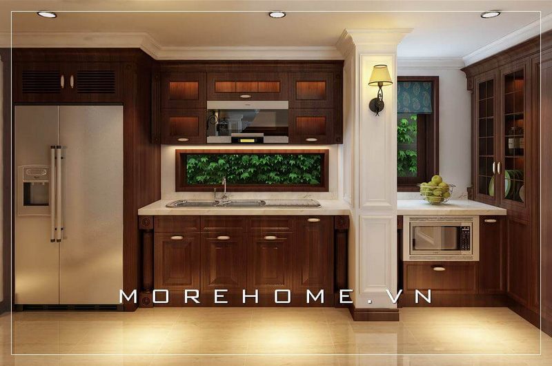 Nội thất phòng bếp từ gỗ tự nhiên mang lại sự sang trọng và tiện nghi cho nhà biệt thự cổ điển.