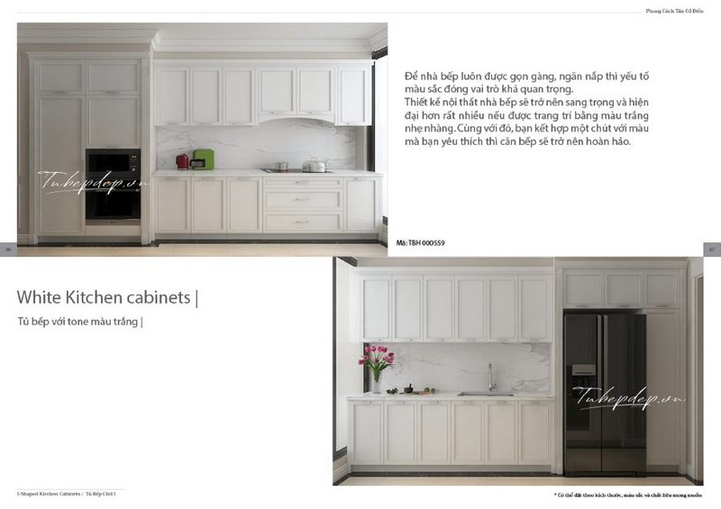 Không gian phòng bếp trở nên sang trọng và tiện lợi hơn rất nhiều với màu sắc tươi sáng. Sắc trắng của tủ bếp tân cổ điển trên đây là một gợi ý cụ thể